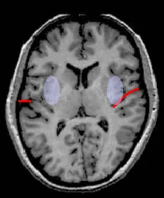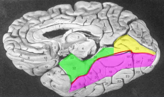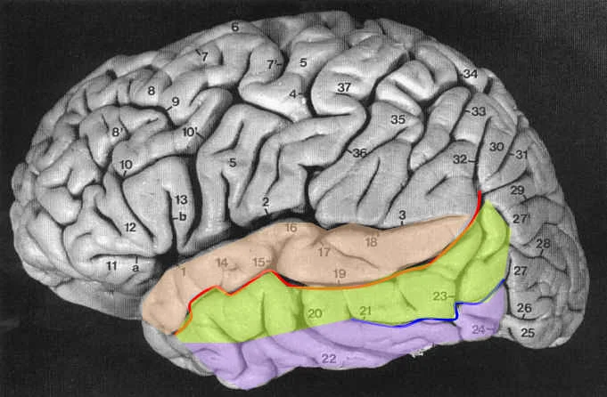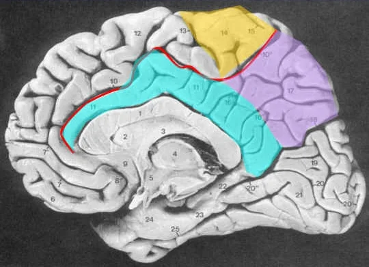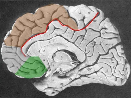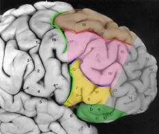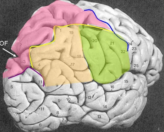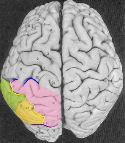 - Frontal pole (grey) and frontal orbital gyrus (green) also shown