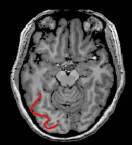 - Divides lingual (yellow) and parahippocampal (green) gyri from fusiform gyrus (pink)