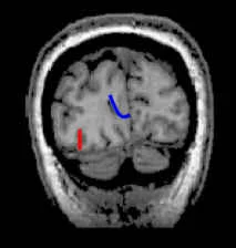 - Marks the anterior end of precentral gyrus (motor strip, yellow)