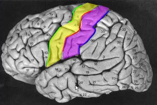 - Marks posterior end of postcentral gyrus (somatosensory strip, purple)
