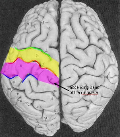 - Divides the cingulate gyrus (turquoise) from precuneus (purple) and paracentral lobule (gold)
